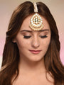 Aniha Maang Tika in dull gold finish studded with pachi kundan and hanging pearl droplets