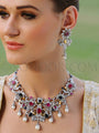 Aurvi Necklace Set with Earrings in silver rhodium finish studded with cubic zircons, iolite, rubies, and hanging pearl droplets