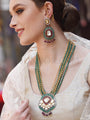 Dafini Pendant Set with Earrings in dull gold finish studded with cubic zircons, kundan, green jade and garnet stones stringing in jade and golden beads
