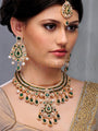 Hemi Necklace Set with Earrings and Maang Tika in dull gold finish (handcrafted) studded with pearls, cubic zircons, and green jade