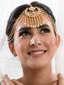 Matha Patti in dull gold finish studded with kundan and hanging pearl droplets