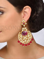 Earrings in dull gold finish studded with kundan, ruby and hanging jade droplets