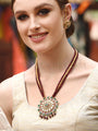 Yasni Pendant Set with Earrings in dull gold finish studded with cubic zircons, ruby, pachi kundan, and jade stones