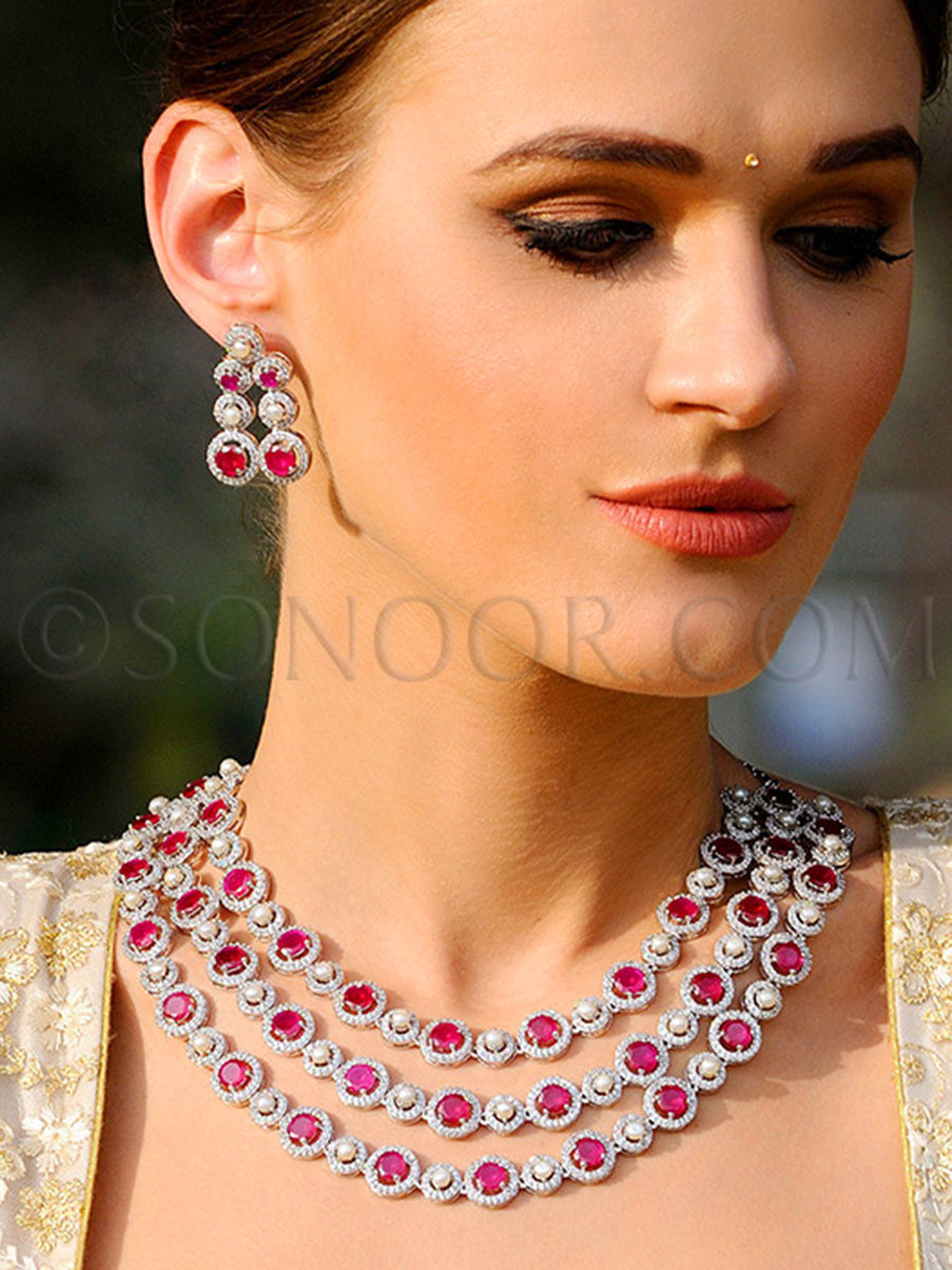 Saina Multi Pearl String Red Stone Long Pendant Set