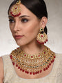 Aafreen Bridal Set with Earrings and Matha Patti in dull gold finish studded with meena kari, kundan stones and hanging pearl droplets
