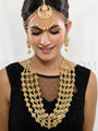 Nadini Bridal Set includes Necklace, Earrings, and Matha Pati in dull gold finish studded with kundan stones and hanging pearl droplets