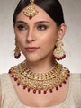 Prerana Bridal Set includes Necklace, Earrings and Maang Tika in dull gold finish studded with pachi kundan and red jade stones
