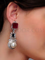 Earrings in silver rhodium finish studded with cubic zircons, pearl and iolite stone