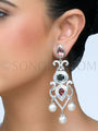 Long Earrings in silver rodium finish studded with cubic zircons, black onyx, rhodonite and hanging pearl droplets