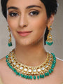 Abia Necklace Set with Earrings in dull gold finish studded with kundan stones and string done in green agate beads