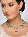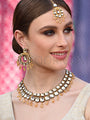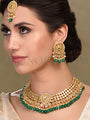 | Suchaya Necklace Set with Earrings and Maang Tika in dull gold finish studded with kundan and hanging green onyx droplets |