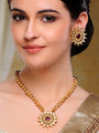 Asvi Pendant Set with Earrings in dull gold finish studded with pachi kundan and ruby