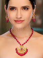 Ushi Pendant Set with Earrings in dull gold finish studded with bikaneri pachi kundan, ruby, and jade